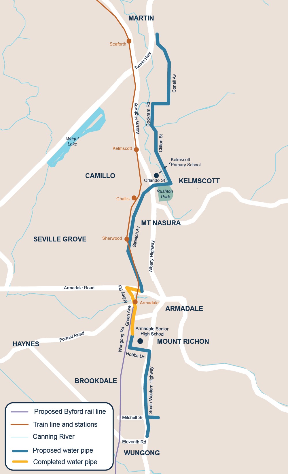 The proposed pipeline route currently includes: Connell Avenue, Pries Park Road, Cockram Road, Clifton Street, Orlando Street, Ottoway Street, Streich Avenue, Armadale Road, Abbey Road, Green Avenue, Wungong Road, Hobbs Drive and South Western Highway. We’re currently finalising the route with the City of Armadale and Gosnells as environmental and heritage checks continue.